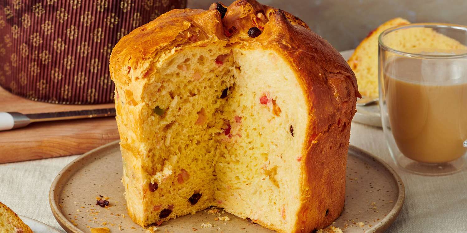 This is the first panettone I’ve made. I had leftover candied fruit and mixed peel from my fruitcakes. I used 1 1/2 cups mixed fruit, 3/4 cup mixed peel, but no zest. I had no paper molds, so I used two 8″ cake pans. Covered with foil after 10 minutes, as the egg wash was turning quite dark. Baked a total of 27 minutes. Once removed from oven, I did a butter rub over the top crust and dusted with icing sugar. Very pleased with how this turned out, and will be making again, but without the egg wash.