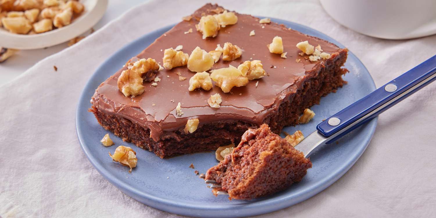 Our most popular Texas Sheet Cake recipe, submitted by Allrecipes community member Carolyn Herbert, has all of the elements of a quintessential funeral cake: A fudgy cake glazed with an easy chocolate icing and sprinkled with walnuts. Here’s how to make it: